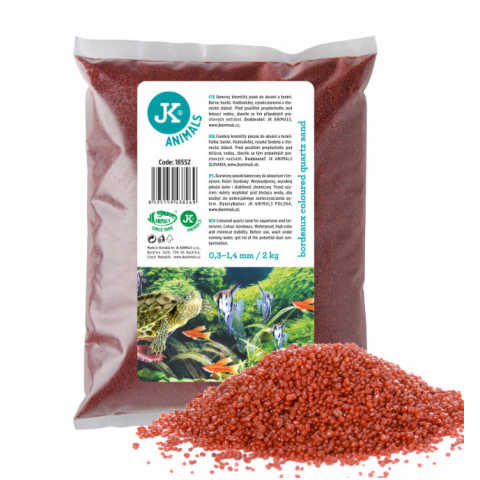 A JK kvarchomok bordó 0,3–1,4 mm szemcseméretű, 2 kg-os természetes akváriumi aljzat, amely meleg, karakteres megjelenést kölcsönöz a víz alatti környezetnek. Nem oldódik, nem színezi el a vizet, és teljesen biztonságos minden vízi élőlény számára. Ideáli