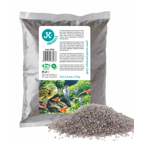 A JK kvarchomok szürke 0,3–1,4 mm szemcseméretű, 2 kg-os természetes akváriumi aljzat, amely letisztult, modern megjelenést biztosít. Nem porzik, nem oldódik, és teljesen biztonságos minden vízi élőlény számára. Ideális választás természetes vagy minimali