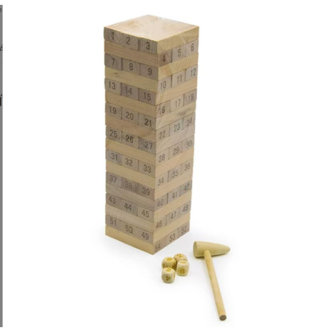 Főbb jellemzők: . 54 részes toronyépítő készlet. hangulatos és egyedi konyhát kínál . Fő cél: kockák kihúzása a toronyból, hogy ne essen szét Minden kockának egyedi száma van . Ügyességi és stratégiai játék . megosztja a figyelmet és segít a fából kés