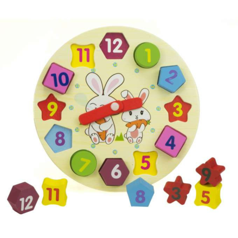 FA ÓRA REJTÉKEL OKTATÁSI VÁLASZTÓ ÁTMÉRŐ 18,5 cm Természetes, világos fából készült számlap színes alkalmazással: Nyúl mintával A számok fa színű kockák, amelyeket a számlapon lévő lyukakhoz kell igazítani Tökéletes színek, formák és számok tanulásár