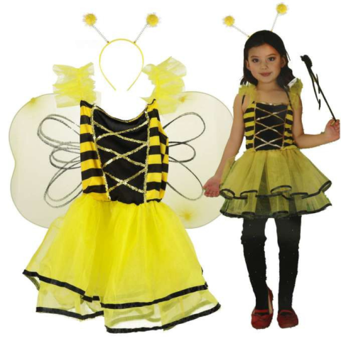 Leírás Méhjelmez, amely ruhából, szárnyakból és antennás fejpántból áll. Tökéletes jelmezpartikhoz, Halloween-hez és tematikus bulikhoz. 100-110 cm magas gyermekek számára készült . Műszaki paraméterek: Anyaga: poliészter Szín: sárga-fekete Méret: