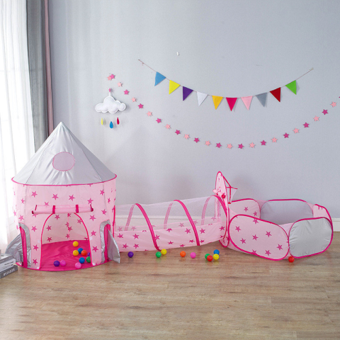 HERCEGES KASTÉLY 3 RÉSZES JÁTSZÓSÁTOR leírása A rózsaszín, herceges gyereksátor egy igazi kisfiús álomvilág, mely három részből áll, egy kastélyból, egy labdamedencéből és egy mászóalagútból. A sátor ideális beltéri és kültéri játékra egyaránt, í