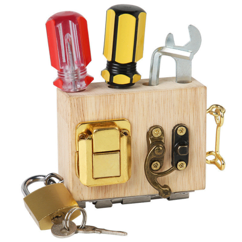 A Montessori csavarhuzós matató kocka remek fejlesztő játék a kicsik számára. Felszereltsége: reteszzárral, viharkampóval, lakattal, csavarokkal, amik segítenek a finommotorikus készség, kézügyesség és koncentráció fejlesztésében. Emellett kellemes sz