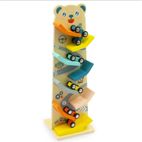 . Mackós-autós fajaték . Fejelszti a kéz-szem koordinációt. Polcszerü elrendezés .Mérete:33x11,5x9 cm . autók mérete:6x3x1 cm és 3,5x3x1 cm. 12 hónapos kortól ajánlott