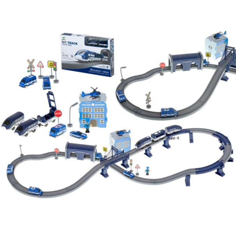 MŰSZAKI ADATOK A játék A verziója. A készlet 92 elemből áll. A dobozban megtalálod: 36 különböző formájú pálya + csatlakozók Alagút Híd Vonat: 2 mozdony és egy nyitókocsi 6 karakter Rendőr 4 rendőrjármű: 3 kamion és 1 személyautó helik