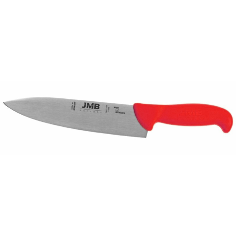 JMB szakácskés 200mm pengével piros Svéd Sandvik 14C28N acélból készül. Ez a legfejlettebb high-tech késacél magas nitrogéntartalommal. Ideálisan finom és homogén szerkezetének köszönhetően ez az acélfajta nagy keménységet, kiváló éltartást és jó korró