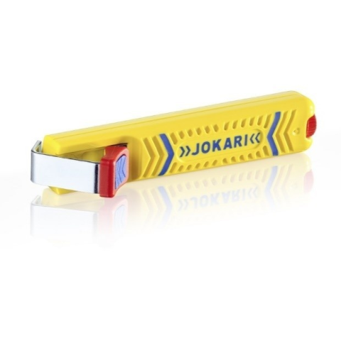 Jokari Secura No. 27 kábelkés standard hengeres kábelekhez! Egyedülálló csúszás gátolt markolat, a jobb fogás és biztonságos használat érdekében. 8-28 mm átmérő standard hengeres kábelek szigetelésének eltávolítására. Állítható vágásmélység Automatikus fo