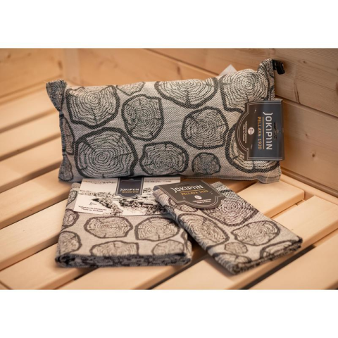 JOKIPIIN prémium szett: szauna párna, szauna fekvőlepedő, szauna ülőlepedő, szürke, farönk mintával lakástextília termékleírás