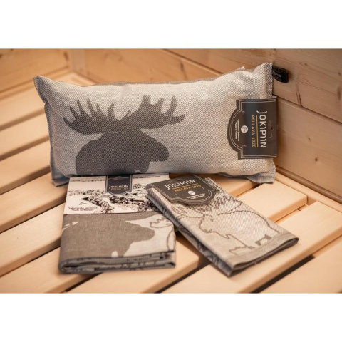 JOKIPIIN prémium szett: szauna párna, szauna fekvőlepedő, szauna ülőlepedő, szürke, jávorszarvas mintával lakástextília termékleírás