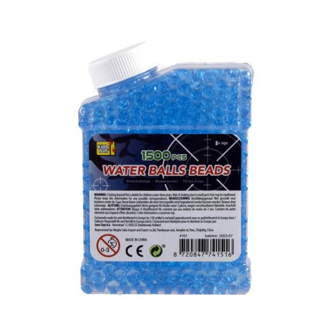 A műanyag tartály 1500 darab kék színű, vízzel töltött gyöngyöt tartalmaz. A hidrogél gyöngyök biztonságosak, puha anyagúak, akadályba ütközve szétpukkannak. Vízibombát kilövő játékfegyverhez is ajánlott. A vízgél gyöngyök átmérője: 6 mm. A termék 3 éves