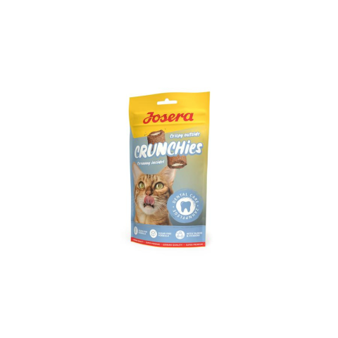 A Josera Crunchies Dental egy ropogós, gluténmentes csemege jutalomfalat csirkével és krémes töltelékkel macskáknak fogkő elleni hatással.