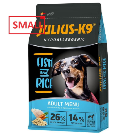 Julius K-9 | Hypoallergenic | Száraztáp | Kistestű felnőtt kutyáknak | Hal, rizs - 12 kg kutyaeledel termékleírás