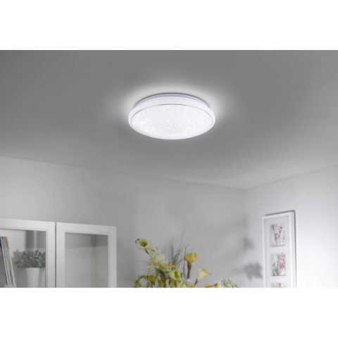 A fehér Lolasmart-Jupi LED-es mennyezeti lámpa csillagos égbolt megjelenése önmagáért beszél. A lámpa egy fixen beépített 27 W-os LED-es izzóval van a csomagban, és körülbelül 2200 lument bocsát ki. A mellékelt infravörös távirányítóval, amely azonnal használatra kész, egyénileg szabályozhatja a fény színhőmérsékletét a melegfehértől (2700 Kelvin) a nappali fehérig (5000 Kelvin), így szimulálhatja a nap folyamán előforduló fényszíneket. A nappali fény