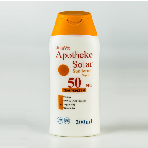 JutaVit Apotheke Solar Napozó SPF 50 A vízálló naptej tartós és hatékony védelmet biztosít a leégés és az UVA és UVB sugárzás ellen. Fényérzékeny bőrűeknek és gyermekeknek ajánljuk! Argán olajjal dúsított, amely omega 3 és omega 6 zsírsavakat tartalmaz.