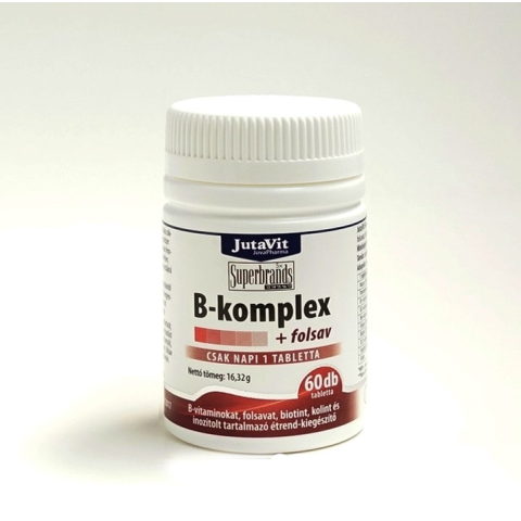 JutaVit B-komplex + folsav  B-vitaminokat, folsavat, biotint, kolint és inozitolt tartalmazó étrend-kiegészítő készítmény.