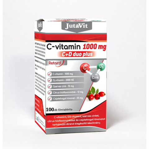 JutaVit C-Vitamin 1000 mg. C+D duo plus. Retard. C-vitamin 1000mg D3-vitamin 2000NE Szerves Cink 15 mg Citrus bioflavonoidok 12 mg Csipkebogyó kivonat 25 mg C-vitamint, D3-vitamint, szerves cinket, citrus bioflavonoidokat és csipkebogyó kivonatot tartalmazó étrend-kiegészítő készítmény. Összetevők: L-aszkorbinsav, tabletta tömegnövelő szerek (mikrokristályos cellulóz, hidroxi-propil-metil-cellulóz, kalciumfoszfátok), cink-glükonát, keserű