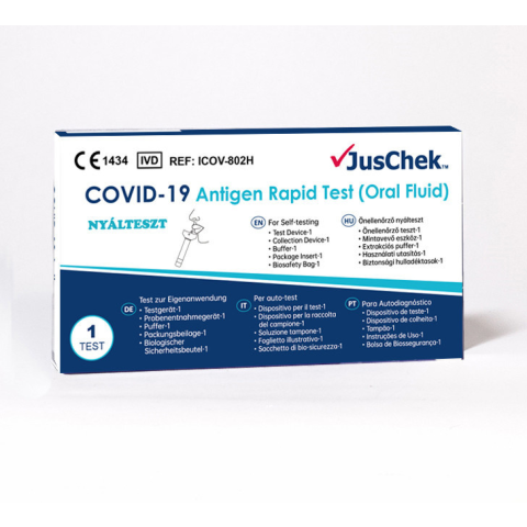 JusChek antigén gyorsteszt orvostechnikai eszköz, mely nyálból vett mintavétellel egy egszer használatos tesztkészlet. A teszteléshez nincs szükség külön szakember jelenlétére, 15 perc alatt bárki letesztelheti magát otthon. Célja a COVID-19-et okozó SARS