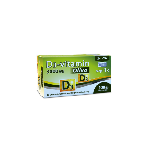 JutaVit D3-vitamin 3000NE (75µg) Olíva 100 db-os D3-vitamin tartalmú étrend-kiegészítő készítmény. A D-vitamin a zsírban oldódó vitaminok családjába tartozik. A JutaVit D3-vitamin 3000 NE Olíva, a D-vitamint extra szűz olívaolajban oldott formában tartal
