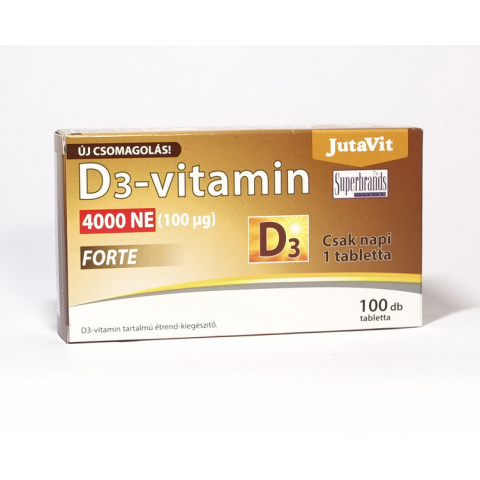 JutaVit D3-vitamin 4000NE (100µg) 100 db-os D3-vitamin tartalmú étrend-kiegészítő. A D3-vitamin hozzájárul a kalcium és foszfor normál felszívódásához/hasznosulásához, a vér normál kálciumszintjéhez, az egészséges csontozathoz, az egészséges izomfunkci