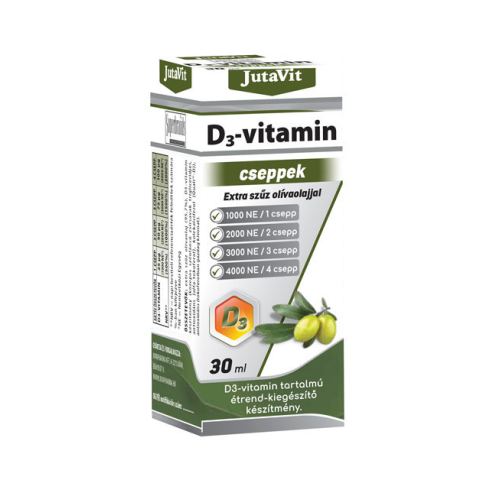 JutaVit D3-vitamin cseppek. Extra szűz olívaolajjal. 1000 NE / csepp. D3-vitamin tartalmú étrend-kiegészítő készítmény. 1000NE / 1 csepp 2000NE / 2 csepp 3000NE / 3 csepp 4000NE / 4 csepp JutaVit D3-vitamin cseppek. Extra szűz olívaolajjal. 1000 NE