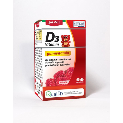 JutaVit D3-vitamin Gumivitamin málna ízű, D3-vitamint tartalmazó étrend-kiegészítő gumivitamin cukrokkal. A D3-vitamin hozzájárul a kalcium és foszfor normál felszívódásához/ hasznosulásához, a vér kalciumszintjének fenntartásához, az egészséges csontoza