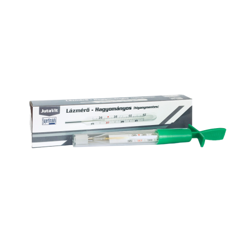 JutaVit Lázmérő (higanymentes) indikátor folyadékkal, ami 100%-ban pontos mérést biztosít. Használat előtt az utoljára mért értéket lerázni szükséges