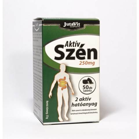 JutaVit Aktív Szén tabletta 250mg, aktív szenet és édeskömény kivonatot tartalmazó étrend-kiegészítő készítmény. JutaVit Aktív Szén tabletta 250mg, 50db. Az aktív szén részt vesz az étkezést követő túlzott bélgáz képződés csökkentésében. Az édeskömény