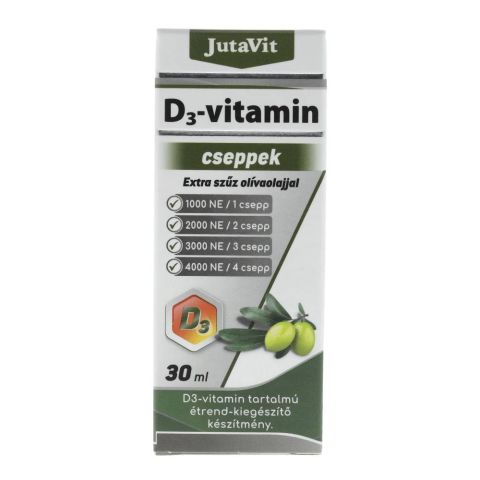 Jutavit d3-vitamin 1000NE cseppek extra szűz olivaolajjal 30 ml JutaVit D3-vitamin cseppek. Extra szűz olívaolajjal. 1000 NE / csepp. D3-vitamin tartalmú étrend-kiegészítő készítmény. 1000NE / 1 csepp 2000NE / 2 csepp 3000NE / 3 csepp 4000NE / 4 c