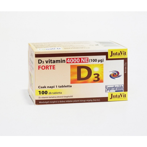 JutaVit D3-vitamin 4000NE (100μg) 100 db-os terméke: A D3-vitamin hozzájárul a kalcium és foszfor normál felszívódásához/hasznosulásához, a vér normál kálciumszintjéhez, az egészséges csontozathoz, az egészséges izomfunkció fenntartásához. JutaVit D3-v