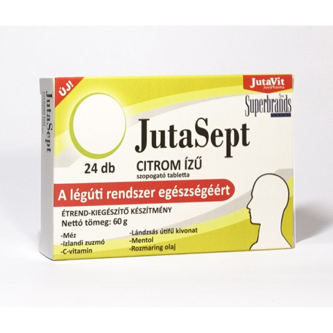 JutaVit JutaSept citrom ízű, mézet, izlandi zuzmót, C-vitamint, lándzsás útifű kivonatot, mentolt és rozmaring olajat tartalmazó étrend-kiegészítő szopogató tabletta édesítőszerekkel, 24 db-os kiszerelésben a légúti rendszer egészségéért. JutaVit JutaS
