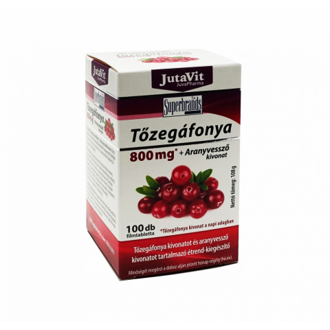 JutaVit Tőzegáfonya 800mg*+Aranyvessző kivonat 100db A JutaVit Tőzegáfonya 800mg*+Aranyvessző kivonat Tőzegáfonya (Vaccinium Macrocarpon) és aranyvessző (Solidago Virgaurea) kivonatot tartalmazó étrend-kiegészítő. Az aranyvessző hozzájárul a húgyutak egés