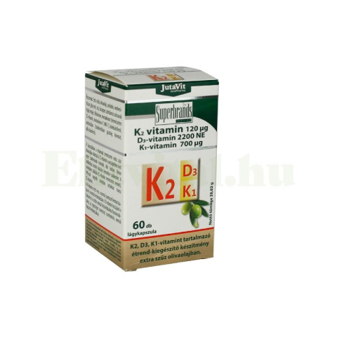 JutaVit K2-vitamin 120µg – D3-vitamin 2200NE – K1-vitamin 700µg 60 db-os terméke. K2, D3, K1-vitamint tartalmazó étrend-kiegészítő készítmény extra szűz olívaolajban.
