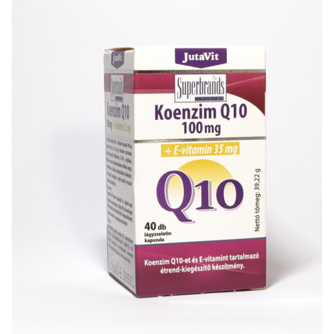 JutaVit Koenzim Q10 100mg +E-vitamin 35mg. Koenzim Q10-et és E-vitamint tartalmazó étrend-kiegészítő. A Jutavit Koenzim Q10 +E-vitamin kapszula 100mg koenzim Q10-et és 35 mg E-vitamint tartalmazó étrend-kiegészítő készítmény. A Q10 a sejtekben, különösen
