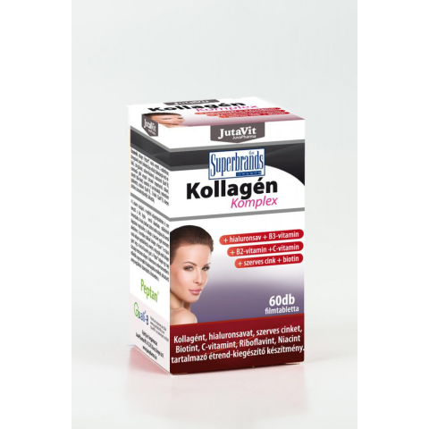 A JutaVit Kollagén komplex + hialuronsav + C-vitamin + szerves cink + Biotin + B2-vitamin + B3-vitamin terméke kollagént, hialuronsavat, szerves cinket, Biotint, C-vitamint, Riboflavint, Niacint tartalmazó étrend-kiegészítő készítmény.