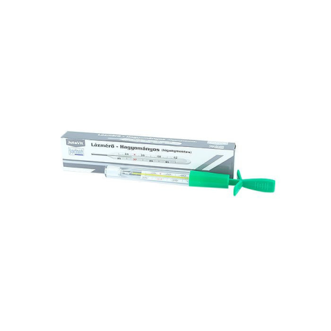A JutaVit Higanymentes lázmérő (orvostechnikai eszköz) indikátor folyadékot tartalmaz, ami 100%-ban pontos mérést biztosít. Használat előtt az utoljára mért értéket lerázni szükséges.