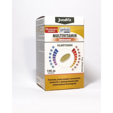 Jutavit multivitamin felnőtteknek nyújtott oldódású tabletta 100 db JutaVit Multivitamin Immuner felnőtteknek. Vitaminokat, ásványi anyagokat, nyomelemeket, koenzim Q10-et, csipkebogyó kivonatot, kolint, inozitolt tartalmazó étrend-kiegészítő. A JutaV