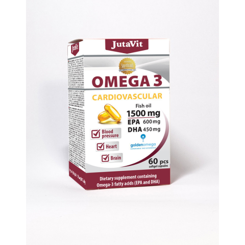 A JutaVit Omega 3 Cardiovascular 1500 mg EPA 600mg, DHA 450mg terméke, szív-és érrendszeri betegségben szenvedők részére Omega-3 zsírsavakat (EPA és DHA) magas mennyiségben tartalmazó termék. A normál vérnyomás fenntartásáért! A szív megfelelő működésé