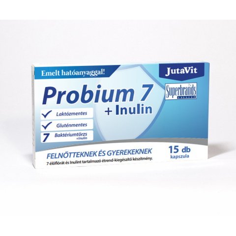 JutaVit Probium 7 + Inulin. Felnőtteknek és Gyermekeknek. 7 élőflórát és Inulint tartalmazó étrend-kiegészítő készítmény. Csomagolás: 1 x 15 db kapszula / bliszter A JutaVit Probium 7 + Inulin termék laktóz- (tejcukor), tejfehérje- és tejmentes, gluté