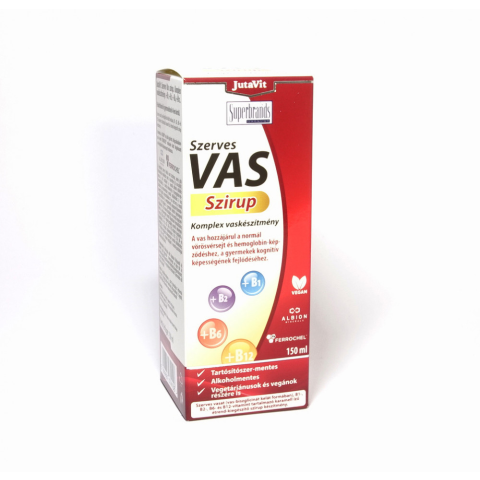JutaVit Szerves Vas szirup, szerves vasat (vas-biszglicinát kelát formában), B1-, B2-, B6- és B12-vitamint tartalmazó karamell ízű étrend-kiegészítő szirup készítmény. Komplex vaskészítmény. A vas hozzájárul a normál vörösvérsejt és hemoglobin-képződésh