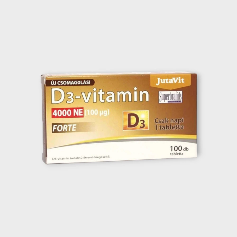 JutaVit D3-vitamin 4000 NE (100 µg) D3-vitamin tartalmú étrend-kiegészítő. A D3-vitamin hozzájárul a kalcium és foszfor normál felszívódásához/hasznosulásához, a vér normál kálciumszintjéhez, az egészséges csontozathoz, az egészséges izomfunkció fen