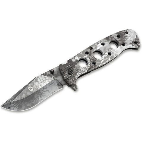 Egy kézzel nyitható bicska mandra camo terepszínben A késhez tartozik még egy gyöngyvászon tok, amely szintén kígyós terep színű. A K25 Python Folder egy taktikai kés Python álcázó mintával. A látványos megjelenés és a kiváló kéztartás a K25 Pythont igazi figyelemfelkeltővé varázsolja. A penge a Flipper vagy a nyitószemölcs segítségével nyílik, és a Linerlock zárja. Hozzáillő nylon övtáskával szállítjuk. A zsebkés főbb jellemzői Penge anyaga: 7Cr1