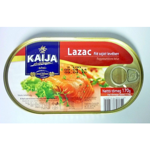 Ízletes lazac filé saját levében Összetevők: lazac (salmon salar) 70%, étkezési só, fűszerekTápanyagok 100 gEnergia:677 kJ (162 kcal)Zsír:10 gSzénhidrát:0 gebből cukor:0 gFehérje:18 gSó:1,2 g