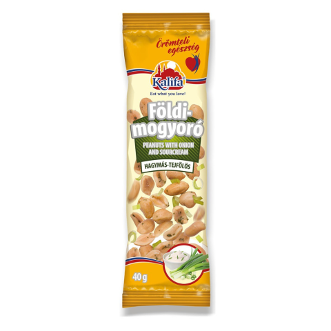 Kalifa földimogyoró hagymás-tejfölös 40 g Hagymás-tejfölös ízű, pörkölt földimogyoróbél védőgázas csomagolásban. Átlagos tápérték 100g termékben- egy adagban(20g). Energia: 2545kj/614kcal- 636kj/154kcal. Zsír: 49,1g- 12g amelyből telített zsírsavak:7,0
