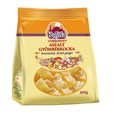 Kalifa gyömbér kandírozott 100 g Aszalt gyömbér kocka (Kandírozott) Összetevők: 100 % Kandírozott, aszalt gyömbér kocka (gyömbér, cukor, tartósítószer: kéndioxid)