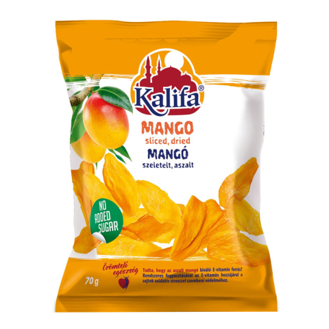 Kalifa mangó szeletelt, aszalt 70 g Szeletelt aszalt mangó védőgázas csomagolásban. Tudta, hogy az aszalt mangó kíváló E-vitamin forrás? Rendszeres fogyasztásával az E-vitamin hozzájárul a sejtek oxidatív stresszel szembeni védelméhez. Összetevők: as