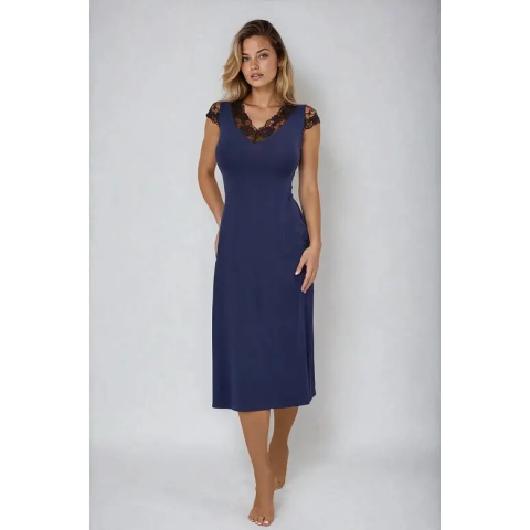 A Langu luxushálóing jól illeszkedő viszkózból készült, gyönyörű csipkerészletekkel rendelkezik a dekoltázs területén és rövid ujjú. A sötétkék színű Langu luxushálóing minőségi viszkózból készült elasztán hozzáadásával, ami kellemes rugalmasságot és kényelmet biztosít viselése során. Elegáns V kivágással ellátott, amely kiváló minőségi csipkével dísztett, rövid ujjú. A hálóing az oldalvarrásnál mért hossza kb. 95 cm. A termék ajándék