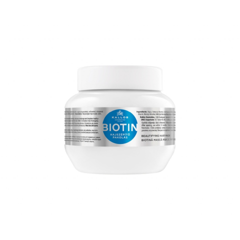 Kallos Biotin hajszépítő pakolás, 275 ml- Speciális tápláló formulája Biotinnal, mélyen táplálja és dúsítja a vékonyszálú, gyenge, fénytelen hajat- Gátolja a hajtöredezést, egészségesebbé, erősebbé, dúsabbá és ragyogóbbá varázsolja a hajszálakat- Aktiválja a hajhagyma anyagcsere-folyamatait, hozzájárul az egészséges hajnövekedéshez- Védi a hajat az idő előtti őszüléstől