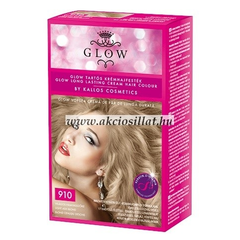 Kallos Glow tartós krémhajfesték 910 világos hamvasszőke 40ml A doboz tartalma: 1 tubus krémhajfesték 40ml 1 doboz Oxi 60ml 1 pár kesztyű 1 használati utasítás Természetes, élénk, és hosszantartó eredményt biztosító profi minőségű krémhajfesték, mely k