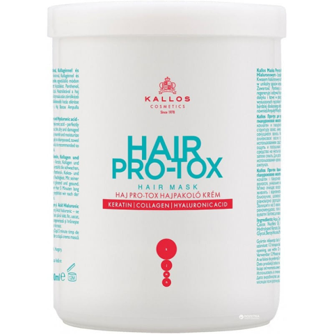 Kallos Hair Pro-Tox Regeneráló Keratinos Hajpakolás 1000ml. A Kallos Hair Pro-Tox Hajpakolás keratinnal, kollagénnel és hialuronsavval készült, intenzív hidratálást és ápolást biztosítva a hajnak. A vitaminokban gazdag egyedi formula segít azonnal javítani a haj szerkezetét, helyreállítja annak fényét és rugalmasságát. A krémes állag könnyen eloszlik a hajon, selymesen simává és egészségessé varázsolva azt.. Jellemzők:. Keratin, kollagén és hialuronsav a mé