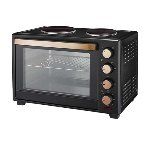 Leírás Kapacitás: 30 L Teljesítmény: 3200W 2db elektromos főzőlap Hőmérséklet szabályozás: 100°C–230°C között 4 vezérlőgomb amellyel külön szabályozható a hőmérséklet a sütőben illetve a főzőlapon , illetve időzítő és sütési mód választás 3 süt